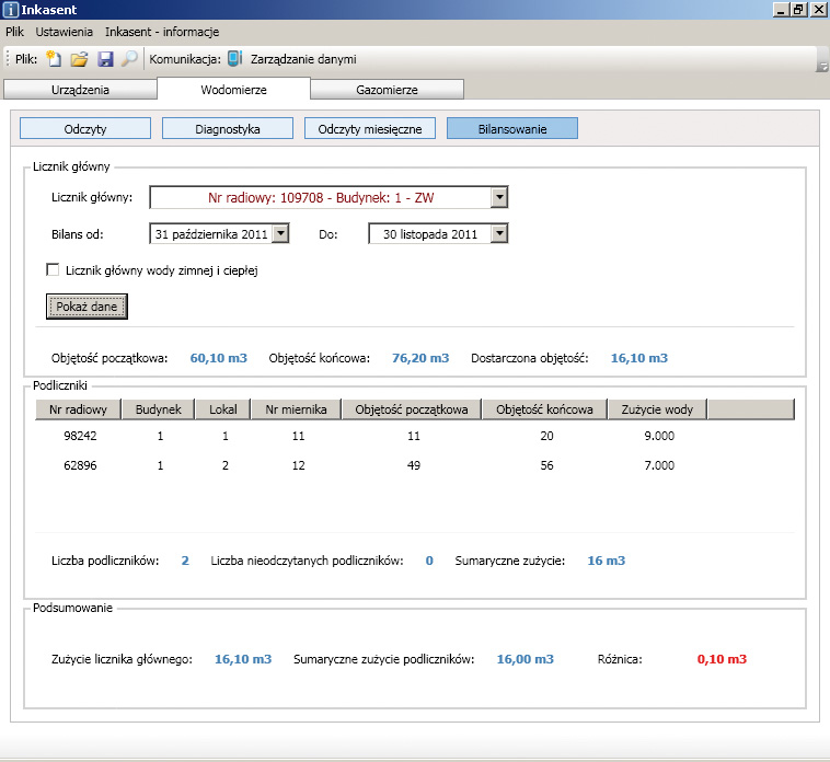 Produkty i uslugi Inkasent PC - Program odczytowy Inkasent PC - Program odczytowy Tworzenie bazy danych wodomierzy i ciepłomierzy wraz z trasami inkasenckimi, Wprowadzenie dowolnych komentarzy przypisanych danemu wodomierzowi Tworzenie raportów dotyczących bilansowania zużycia wody, ciepła